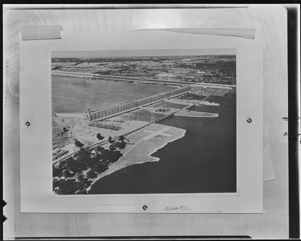 Reproduction et montage d'une photographie illustrant une vue aérienne sur la centrale hydroélectrique de Beauharnois, Montérégie