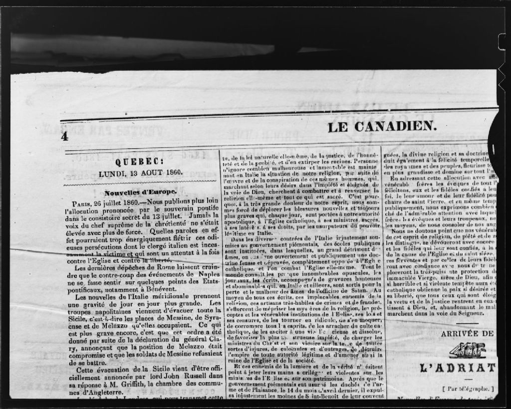 Article "Bazar" concernant la Banque Nationale, extrait du journal "Le Canadien" du 13 août 1860, Janvier 1974, Archives nationales à Montréal, Fonds Armour Landry, (06M,P97,S1,D20095-20097), Armour Landry.