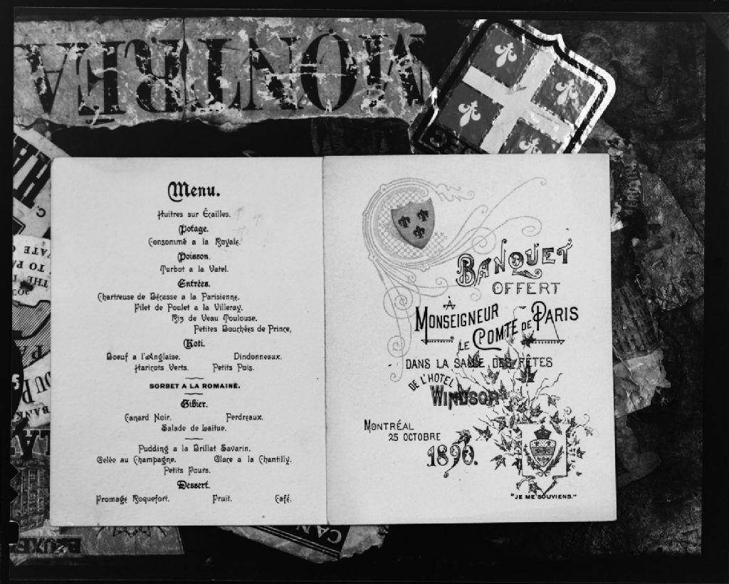 Le cliché n°20327 correspond au menu du banquet offert à Monseigneur le Compte de Paris dans la salle des fêtes de l'hôtel de Windsor le 25 octobre 1890. Le cliché n°20328 correspond au menu proposé lors de l'inauguration de l'Hôtel de France en mai 1874. Les clichés n°20329 et 20330 correspondent au menu proposé pour l'inauguration du restaurant Ethier à l'angle des rues Notre-Dame Est et Saint-Gabriel à Montréal