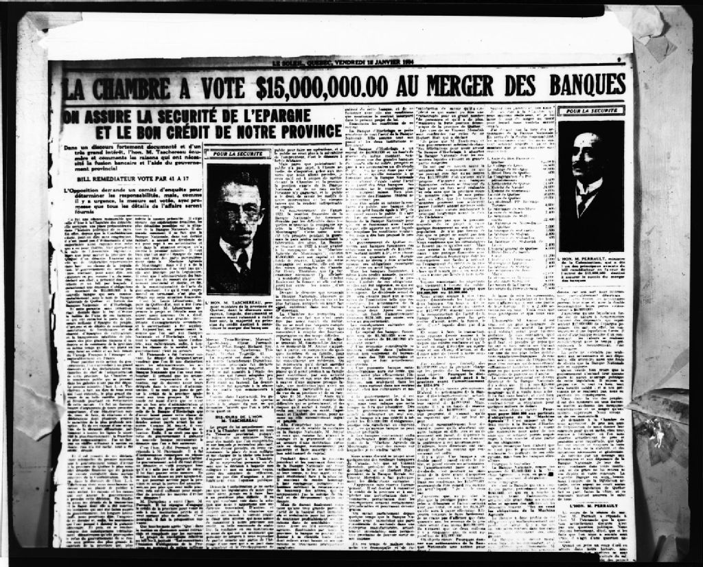 Extraits de journaux concernant la fusion des banques d'Hochelaga et Nationale, 10 avril 1974, Archives nationales à Montréal, Fonds Armour Landry, (06M,P97,S1,D20384-20388), Armour Landry.