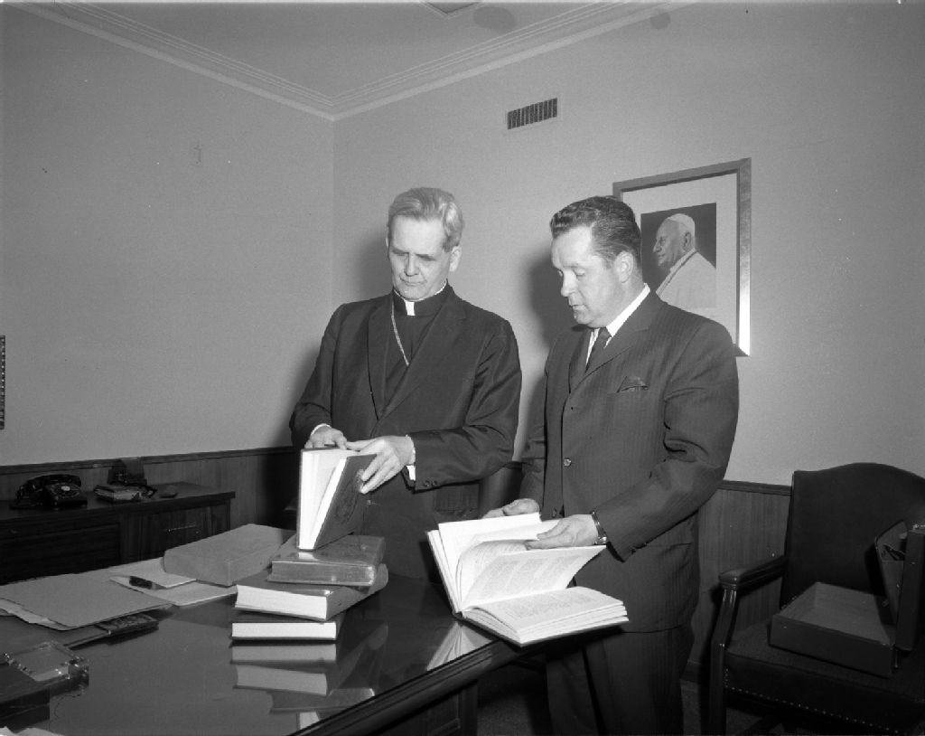 Le cardinal Paul-Émile Léger, archevêque de Montréal, et André Dion des Éditions Moulinsart, boulevard Henri-Bourassa à Montréal