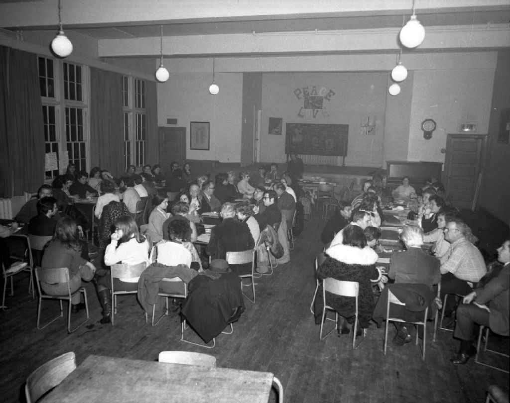 Groupe de citoyens en faveur de l'implantation d'une clinique communautaire, réunis au St-Columba's Hall dans le quartier Pointe Saint-Charles à Montréal, 9 mars 1971, Archives nationales à Montréal, Fonds Armour Landry, (06M,P97,S1,D233-240), Armour Landry.
