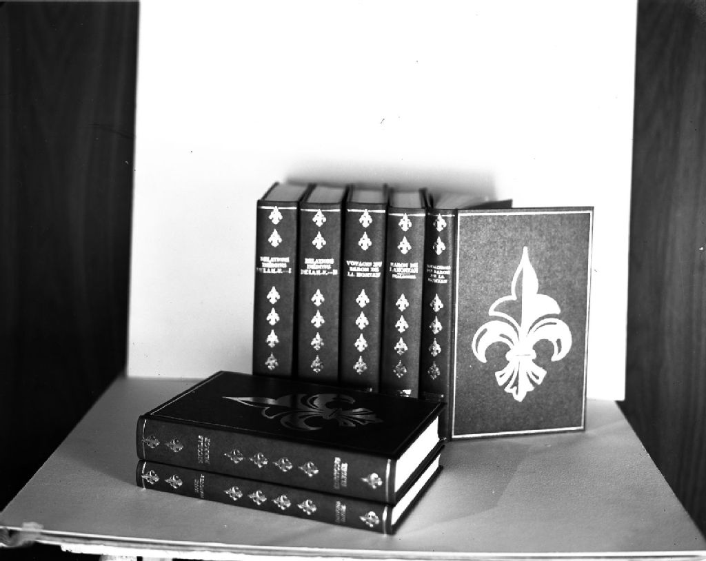 Il s'agit des reliures d'éditions anciennes des livres suivants : "Relations inédites", "Voyages du baron de La Hontan", "Baron de La Hontan : Dialogues", "Mémoires du baron de La Hontan", "Louis Franquet", "Nicolas Perrot", "Dictionnaire généalogique des familles canadiennes" de Cyprien Tanguay et la page titre de "Histoire et description générale de la Nouvelle France"