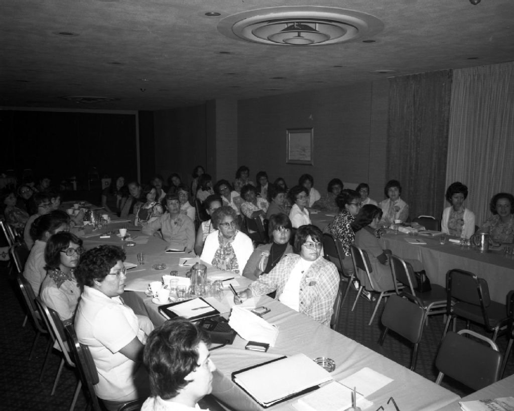 Claire Bigué, infirmière et rédactrice en chef de la revue «Infirmière canadienne», accompagnée de membres de l'Association des infirmières et infirmiers du Canada, 1 décembre 1968, Archives nationales à Montréal, Fonds Armour Landry, (06M,P97,S1,D279-283), Armour Landry.