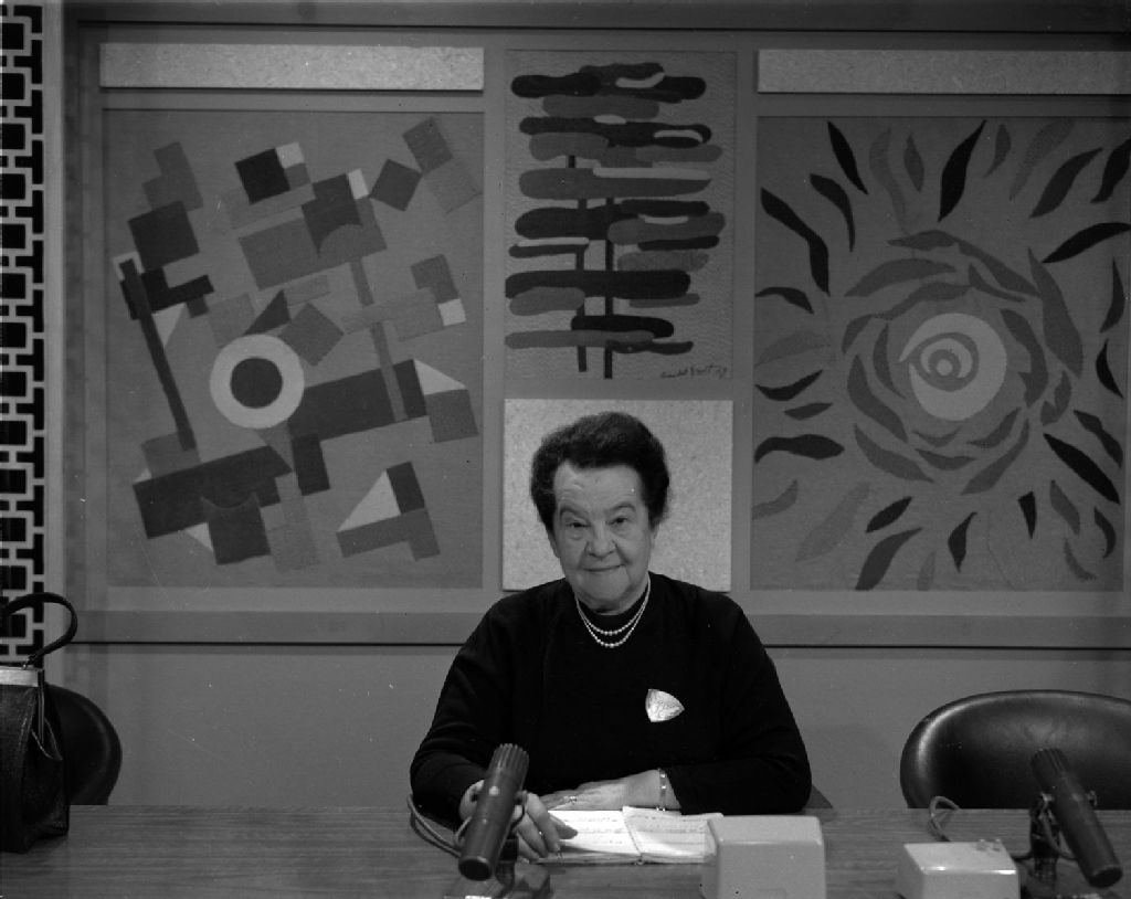 Françoise Gaudet-Smet, auteure, journaliste et fondatrice de la revue "Paysana", dans les studios de Télé-Métropole, devenu TVA, rue Alexandre-DeSève à Montréal