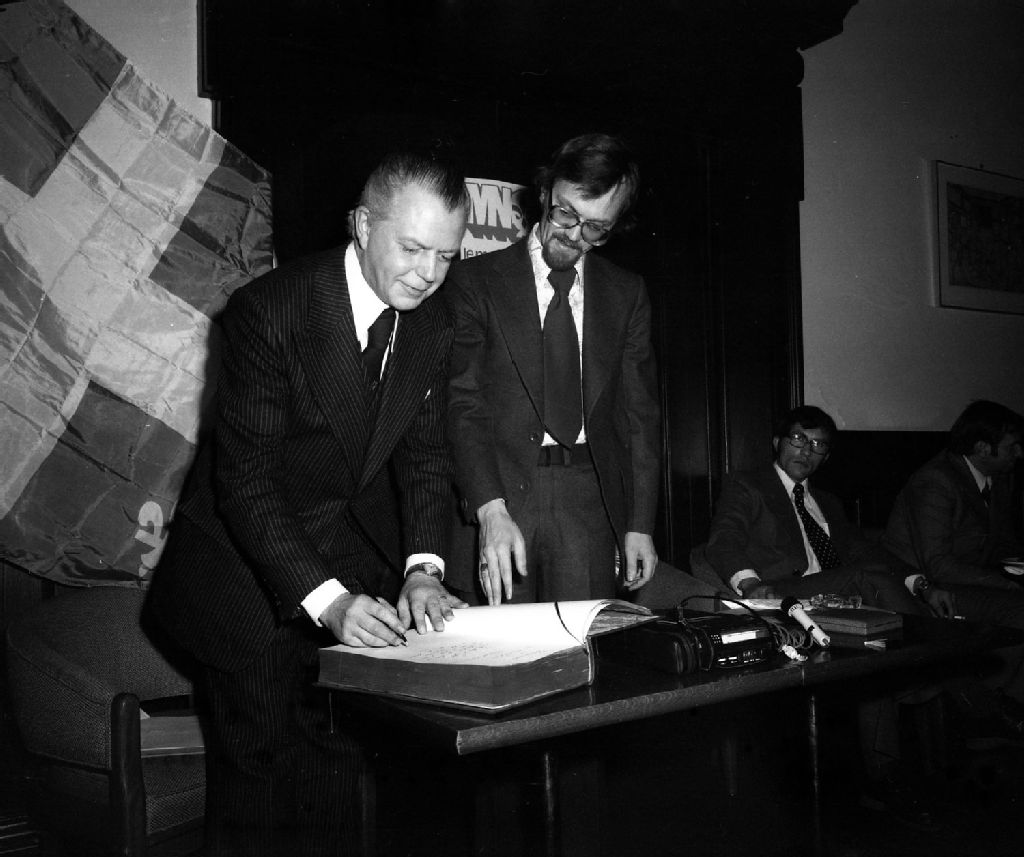 - Ce dossier présente la remise de la médaille MNQ à M. Léger au cours d'une réception du Mouvement national des Québécois en novembre 1975 (P4122-4132) ainsi qu'une assemblée générale du Mouvement nationale des Québécois au siège social de la Société Saint-Jean-Baptiste de Montréal, boulevard Saint-Laurent à Montréal, en avril 1976 (P3133-3147)