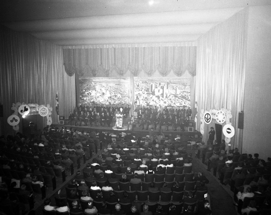 - Inauguration de la campagne électorale d'octobre 1970 du Parti civique de Montréal au théâtre Champlain, rue Sainte-Catherine à Montréal. Le chef du parti et maire de Montréal, Jean Drapeau, prononce un discours