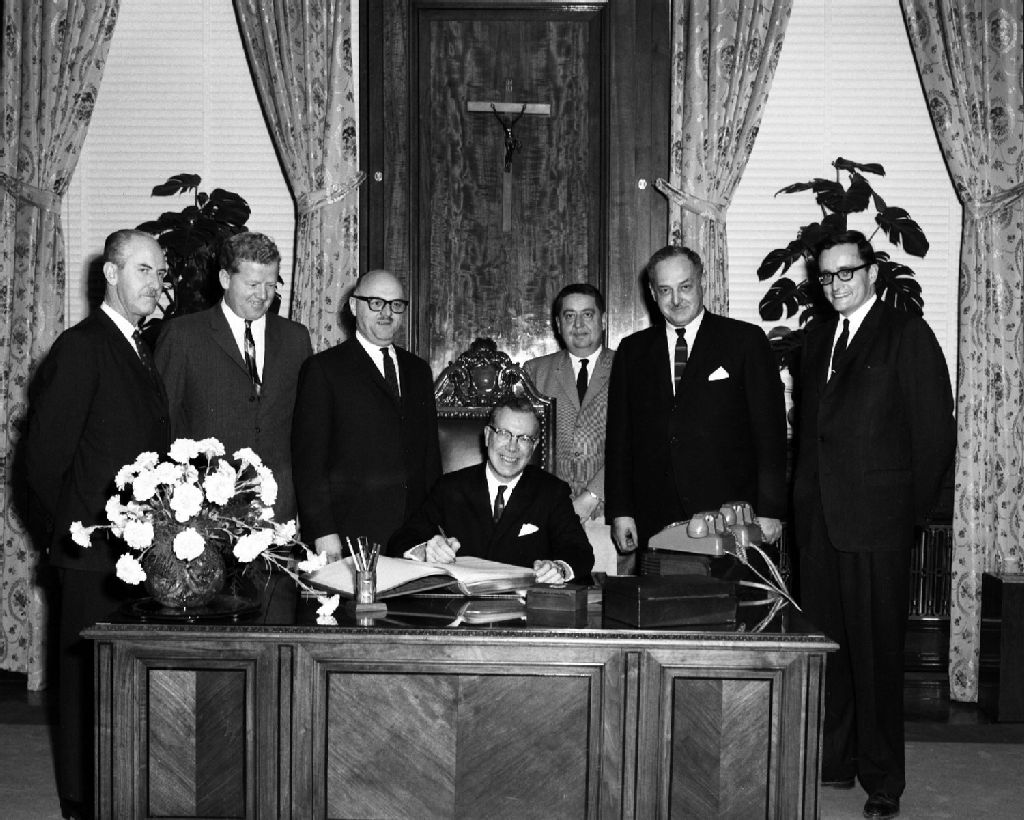 Le premier ministre du Manitoba, Dufferin Roblin, au cours d'une causerie de la Chambre de commerce du district de Montréal à l'hôtel Mont-Royal, rue Peel, et devant la Plaque commémorative de Pierre Gauthier de La Vérendrye, à Montréal. Le maire de Montréal, Jean Drapeau, est présent pour l'occasion, 10 décembre 1963, Archives nationales à Montréal, Fonds Armour Landry, (06M,P97,S1,D4536-4538), Armour Landry.
