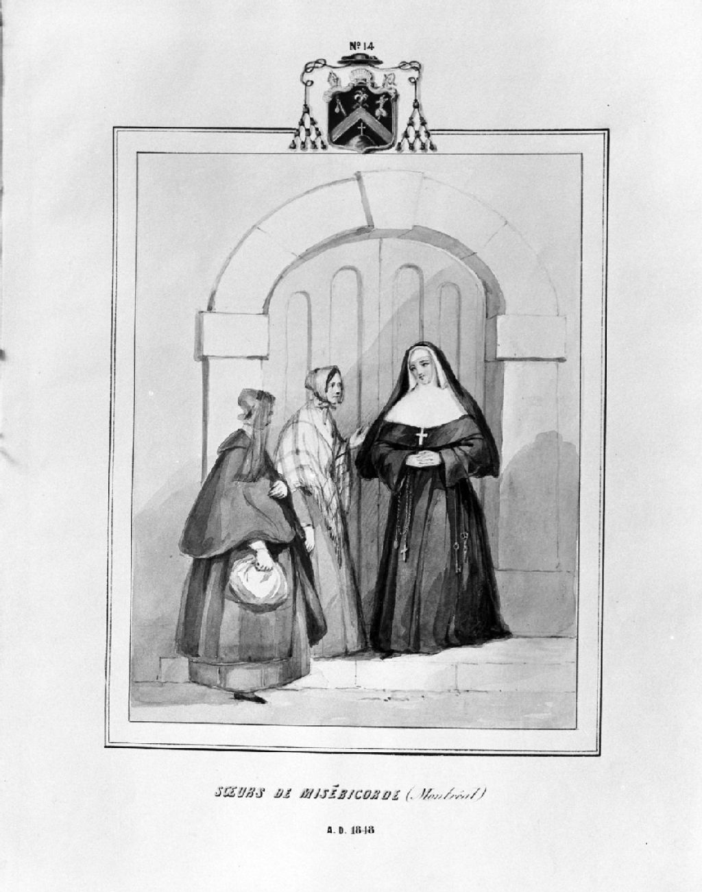 Reproduction de dessins de soeurs de miséricorde provenant de l'album de Jacques Viger (1853) ainsi qu'une vue aérienne de la maison mère des Soeurs de miséricorde, avenue de la Miséricorde à Montréal