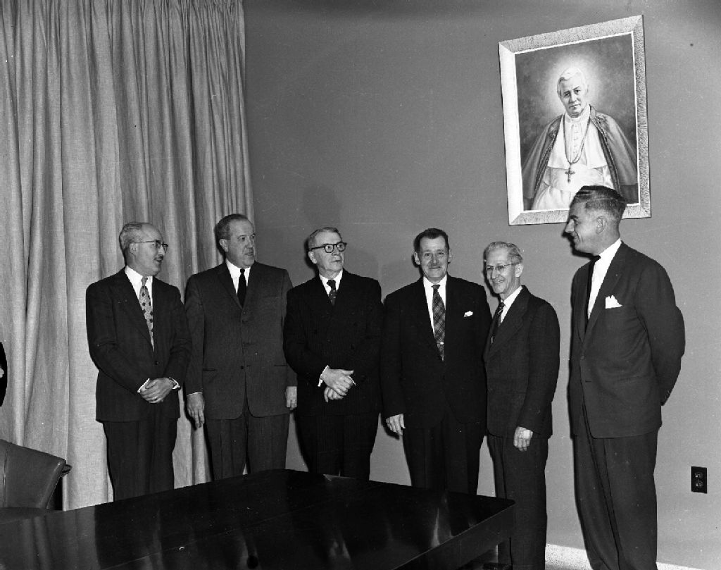 Phidias Tanguay en compagnie de cadres des Caisses populaires Desjardins et la femme de Phidias Tanguay, [Vers 1965], Archives nationales à Montréal, Fonds Armour Landry, (06M,P97,S1,D4946-4947), Armour Landry.
