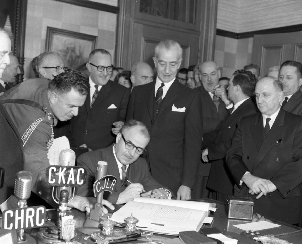 Assermentation de Gérard Thibeault en tant que ministre d'État dans le cabinet d'Antonio Barrette. Le premier ministre du Québec, Antonio Barrette, le ministre du Bien-Être social, Jean-Jacques Bertrand, le ministre des Ressources hydrauliques, Daniel Johnson ainsi que le ministre des Mines, William M. Cottingham, sont présents pour l'occasion, [Vers 1965], Archives nationales à Montréal, Fonds Armour Landry, (06M,P97,S1,D4954-4954), Armour Landry.