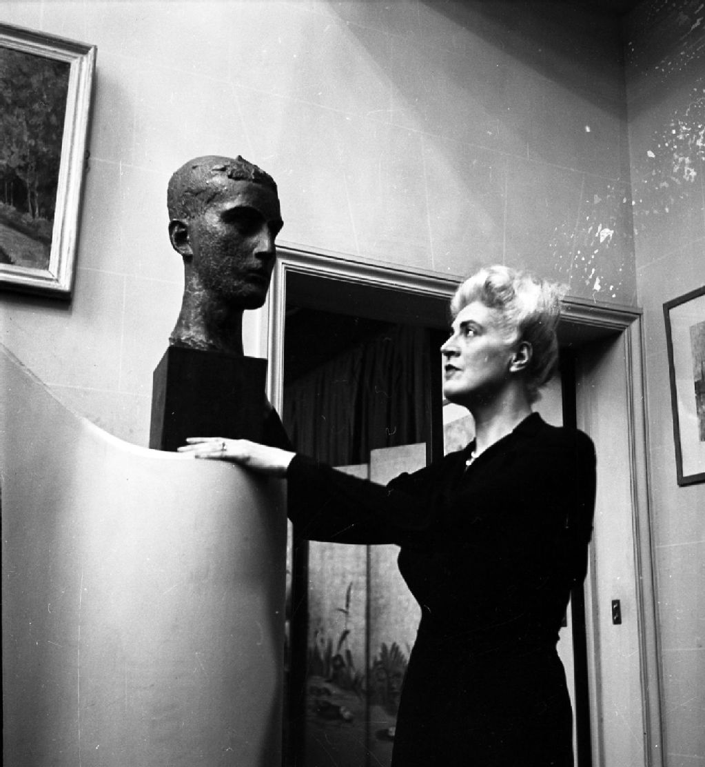 Pauline Archer, la femme de l'ambassadeur du Canada en France, Georges Vanier, devant le buste de son fils, trappiste, à l'Ambassade du Canada à Paris, Décembre 1947, Archives nationales à Montréal, Fonds Armour Landry, (06M,P97,S1,D5146-5146), Armour Landry.