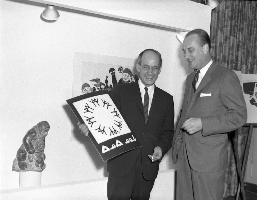 Le député de la circonscription électorale provinciale de Laurier, René Lévesque, remet une plaque de l'Expo 67 rédigé en langue inuit à M. De Bellefeuille