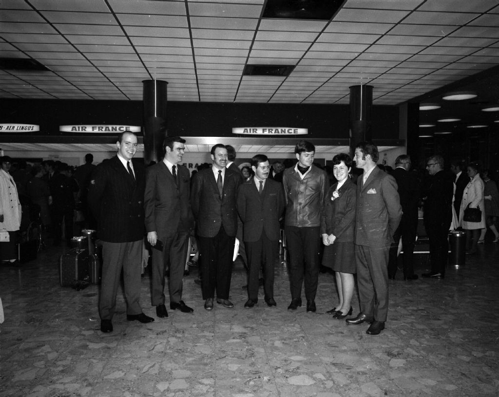 Départ pour la France d'un groupe de boursiers provenant des Universités de Montréal, de Laval et de Sherbrooke devant les barrières d'Air France à l'aéroport de Dorval, 17 mai 1969, Archives nationales à Montréal, Fonds Armour Landry, (06M,P97,S1,D5304-5305), Armour Landry.