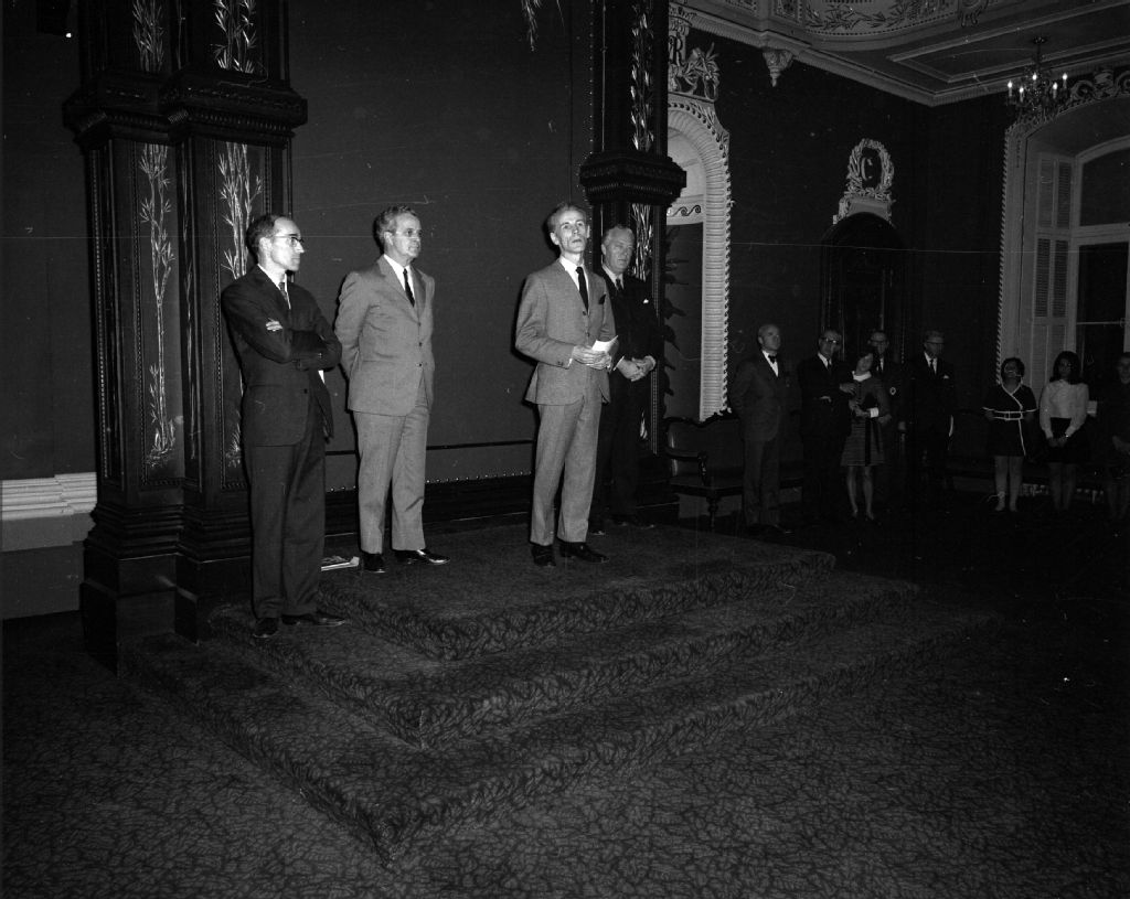 Proclamation des lauréats du Concours littéraire du Québec, au Parlement de Québec. Le ministre des Affaires culturelles, Jean-Noël Tremblay, et le chef de l'opposition officielle, Jean Lesage, sont présents pour l'évènement