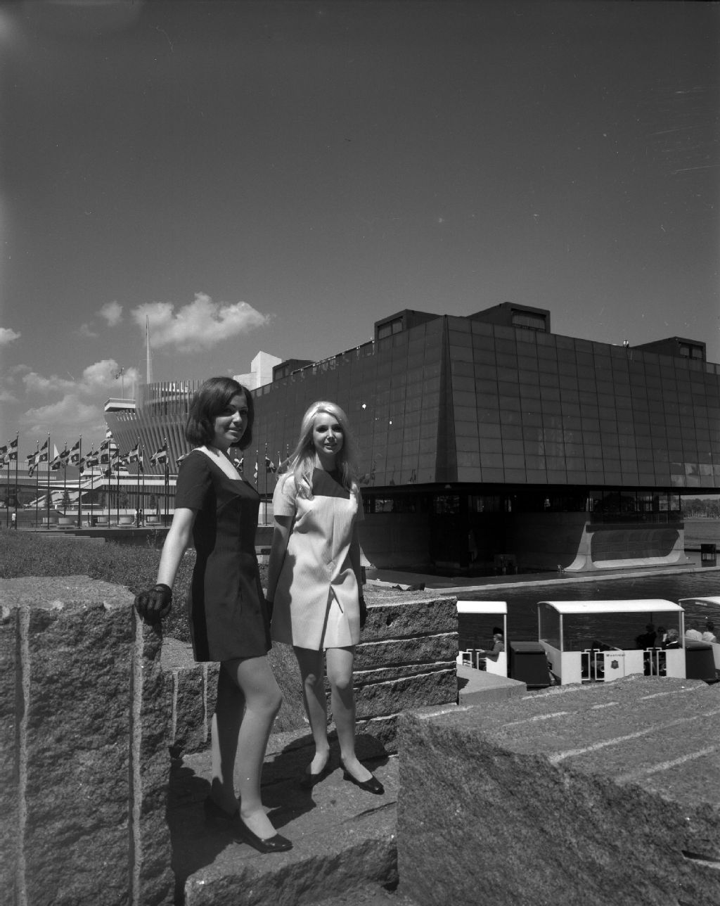 Deux hôtesses du Pavillon du Québec de l'exposition permanente Terre des Hommes à Montréal portent les habits d'hôtesse confectionnés par Anne-Marie Perron, 15 juin 1968, Archives nationales à Montréal, Fonds Armour Landry, (06M,P97,S1,D5477-5483), Armour Landry.