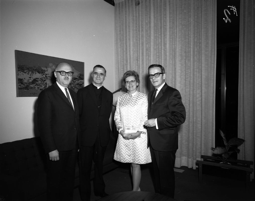 Visite du cardinal Maurice Roy au Pavillon du Québec à l'exposition permanente Terre des Hommes à Montréal. Le cardinal est accompagné pour l'occasion du Ministre d'État délégué au Haut-Commissariat à la jeunesse, aux loisirs et aux sports et responsable de l'Office franco-québécois pour la jeunesse, Jean-Marie Morin, ainsi que du maire de Montréal, Jean Drapeau