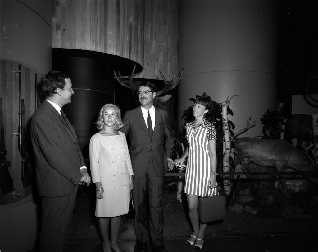 Visite d'une délégation de jeunes français au Pavillon du Québec à l'exposition permanente Terre des Hommes à Montréal. Ces jeunes participent à un programme d'échange ou de stage offert par l'Association France-Québec, 13 août 1968, Archives nationales à Montréal, Fonds Armour Landry, (06M,P97,S1,D5565-5565), Armour Landry.