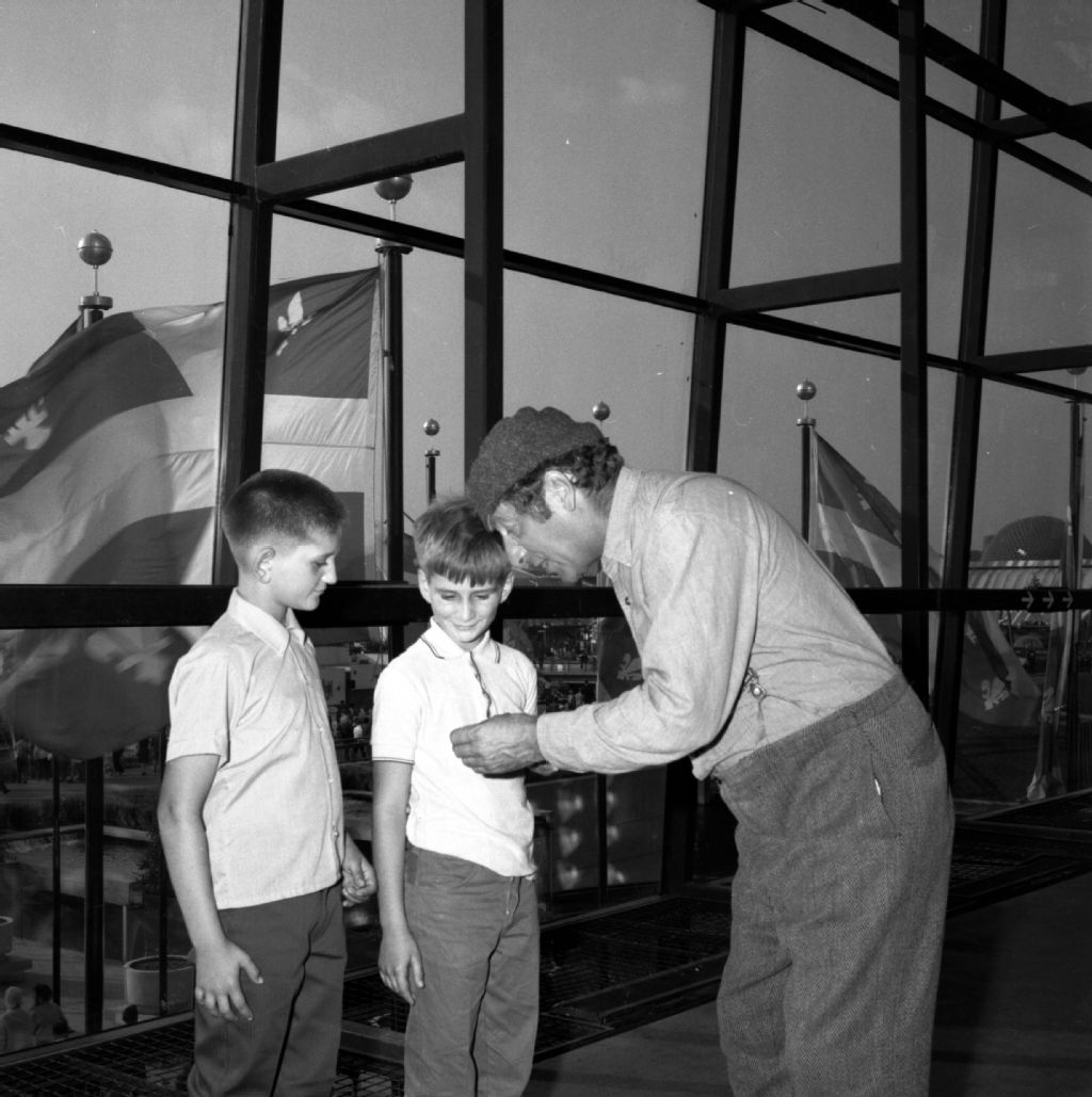Visite de l'interprète de "Séraphin Poudrier", personnage de la télésérie populaire "Les Belles histoires des pays d'en haut", Jean-Pierre Masson, au Pavillon du Québec, à l'exposition permanente Terre des Hommes à Montréal, 22 septembre 1968, Archives nationales à Montréal, Fonds Armour Landry, (06M,P97,S1,D5721-5721), Armour Landry.