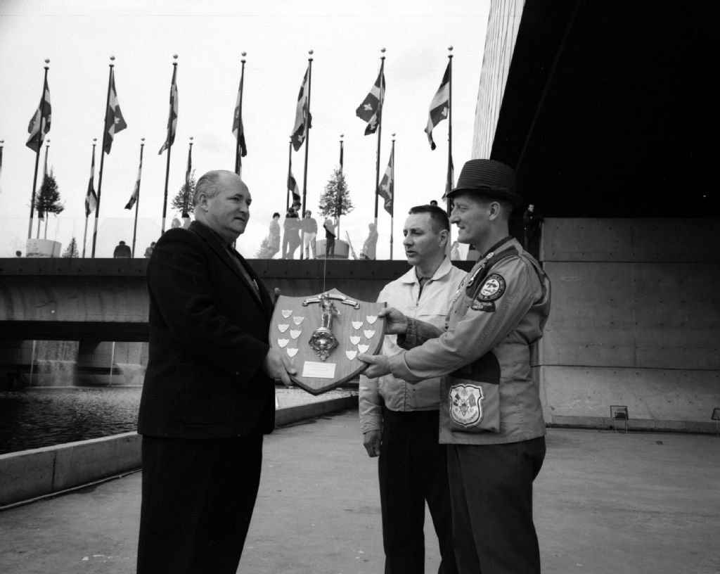 Remise de prix à l'occasion d'un tournoi à la mouche devant le Pavillon du Québec, à l'exposition permanente Terre des Hommes à Montréal, Octobre 1968, Archives nationales à Montréal, Fonds Armour Landry, (06M,P97,S1,D5728-5730), Armour Landry.