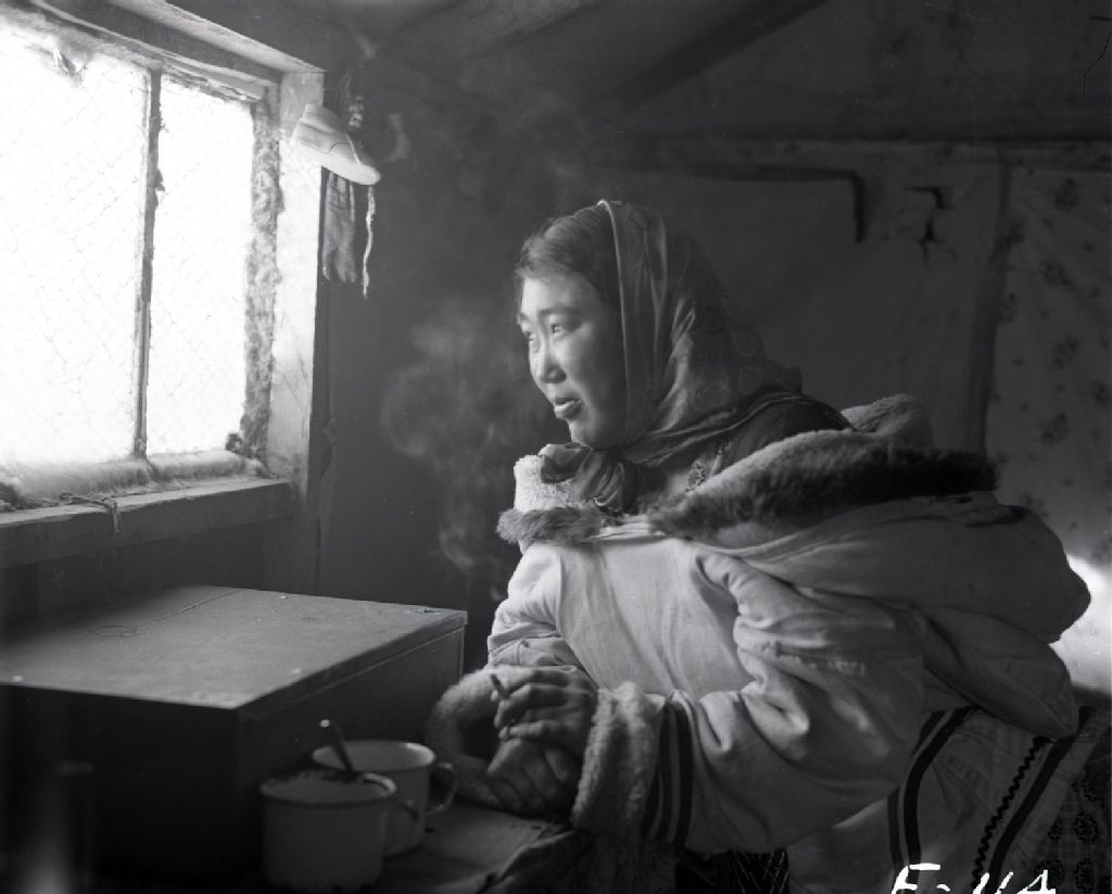 Une femme inuit dans un abri près de l'embouchure de la rivière Koksoak dans la région de la baie d'Ungava