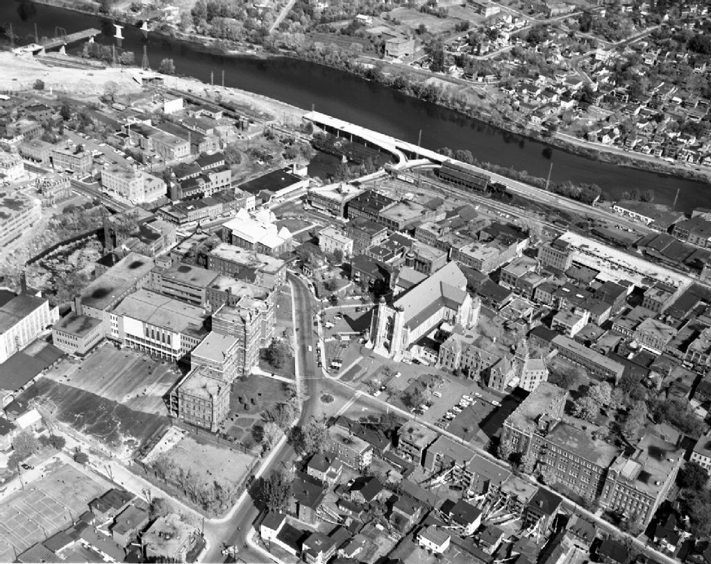 Vue aérienne du quartier environnant la cathédrale Saint-Michel à Sherbrooke