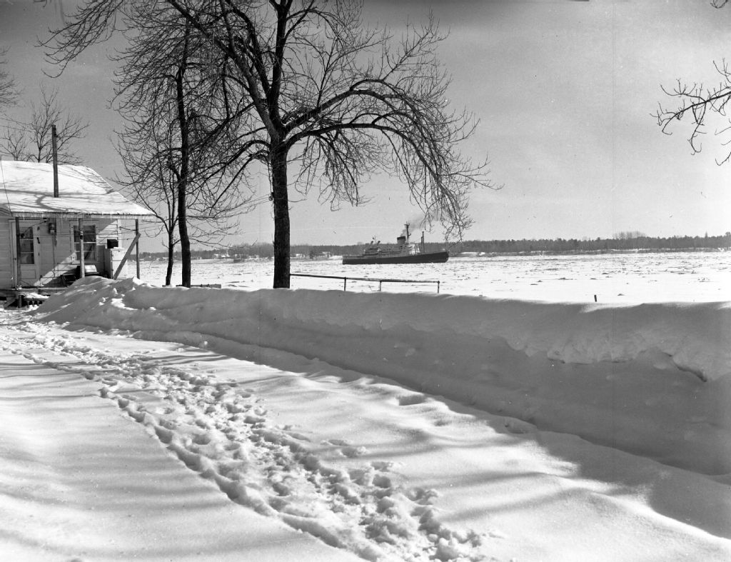 Brise-glace du ministère des Transports et de la Marine ouvrant le chenal maritime, au printemps, dans le Saint-Laurent entre Québec et Montréal