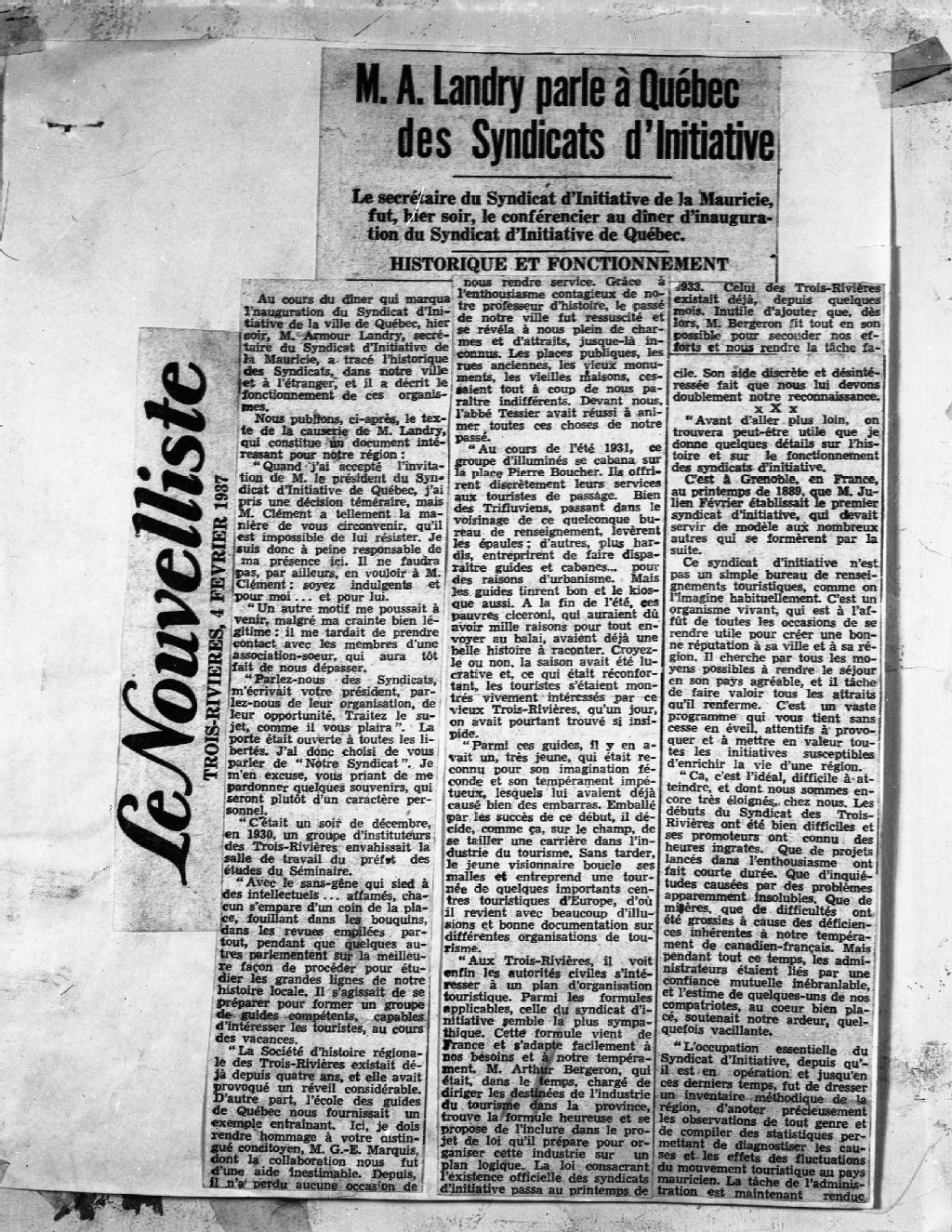 Reproduction en page 1 et 2 du discours d'Armour Landry lors de l'inauguration du Syndicat d'Initiative de la ville de Québec, paru dans "Le Nouvelliste" de Trois-Rivières du 4 février 1937