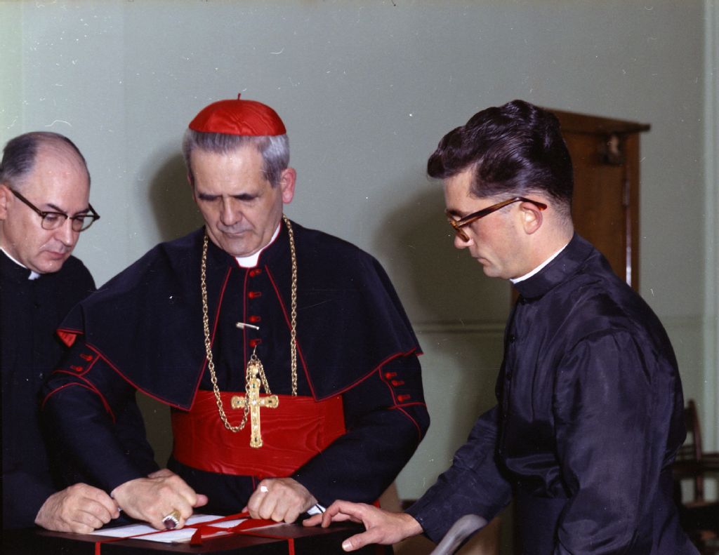 Le cardinal Paul-Émile Léger est de passage au Centre Marguerite-Bourgeoys de la Congrégation Notre-Dame, [Vers 1965], Archives nationales à Montréal, Fonds Armour Landry, (06M,P97,S1,D7270-7270), Armour Landry.