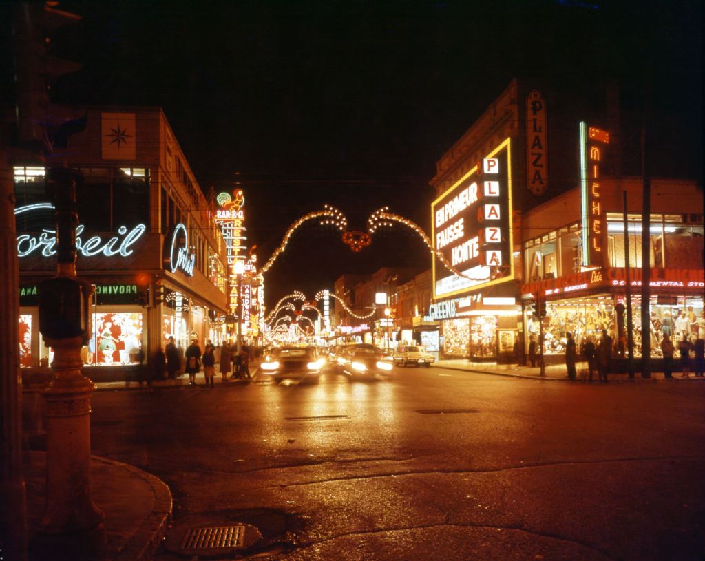 La Plaza de la rue Saint-Hubert décorée pour les fêtes de Noël, de nuit