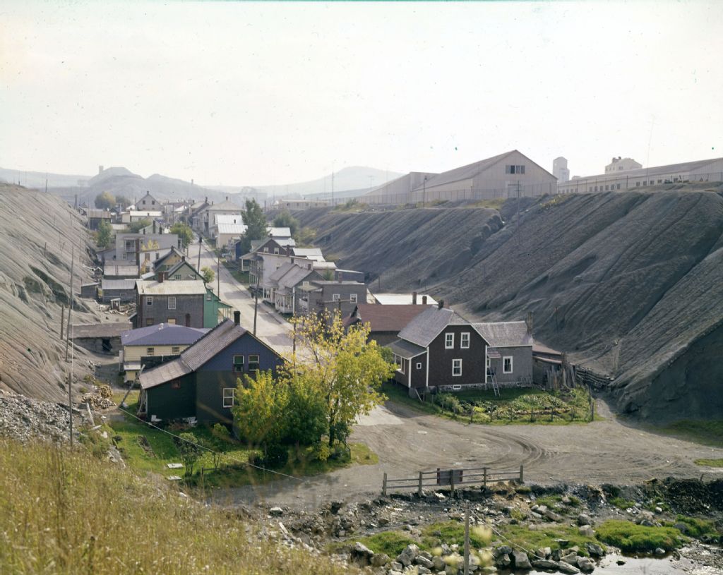 Maisons sur une rue de Thetford Mines au milieu de deux monticules de déchets d'amiante, [Vers 1965], Archives nationales à Montréal, Fonds Armour Landry, (06M,P97,S1,D7689-7689), Armour Landry.