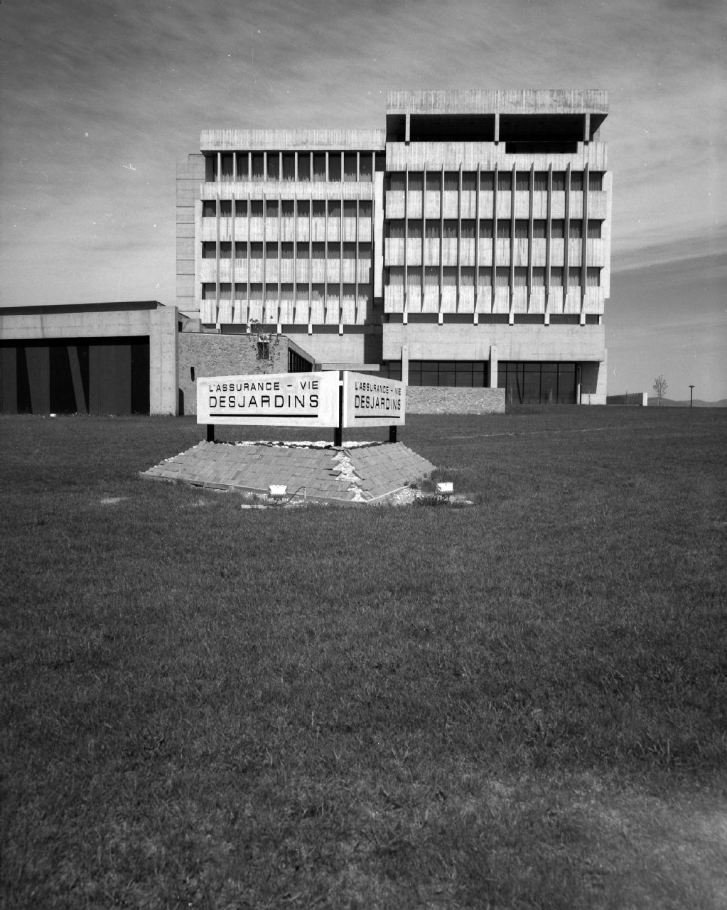 Architecture extérieure du siège social de l'Assurance-vie Desjardins, devenu Desjardins Sécurité financière, rue des Commandeurs à Lévis, 24 mai 1970, Archives nationales à Montréal, Fonds Armour Landry, (06M,P97,S1,D775-778), Armour Landry.