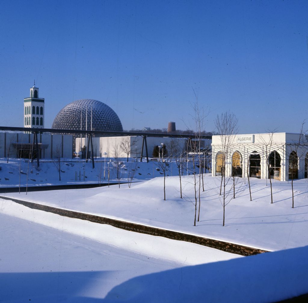 Le pavillon de l'Algérie de l'exposition universelle de 1967 durant l'hiver 1968, [Vers 1968], Archives nationales à Montréal, Fonds Armour Landry, (06M,P97,S1,D7781-7781), Armour Landry.