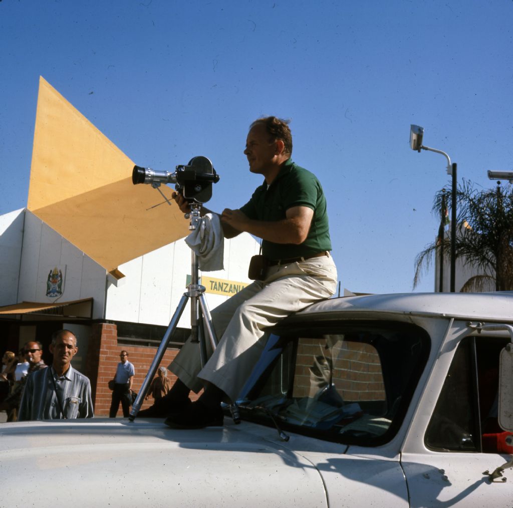 Cinéaste filmant sur le site de Terre des Hommes, [Juin 1968], Archives nationales à Montréal, Fonds Armour Landry, (06M,P97,S1,D7800-7800), Armour Landry.