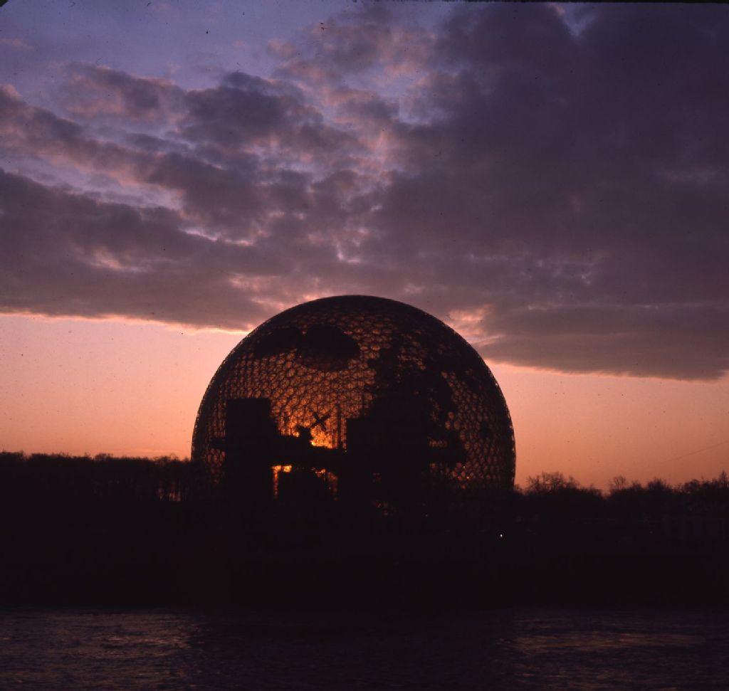 Exposition universelle de 1967; le dôme géodésique du pavillon des États-Unis d'Amérique, au soleil couchant