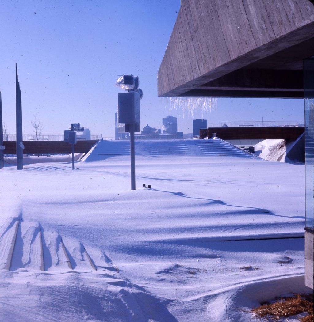 Le site de l'Exposition universelle de 1967 durant l'hiver; la Place des Nations sous la neige