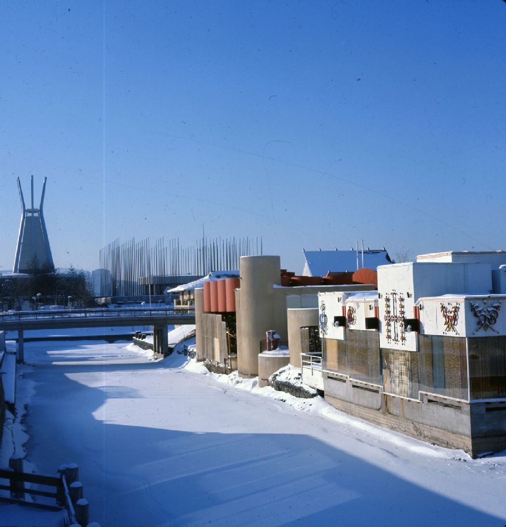 Le site de l'Exposition universelle de 1967 durant l'hiver; un canal gelé, le pavillon d’Haïti et celui des Indiens du Canada