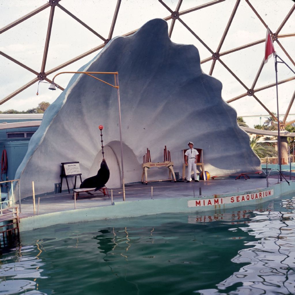 Floride: spectacle d'otaries au Seaquarium de Miami, [Vers 1960], Archives nationales à Montréal, Fonds Armour Landry, (06M,P97,S1,D8003-8003), Armour Landry.
