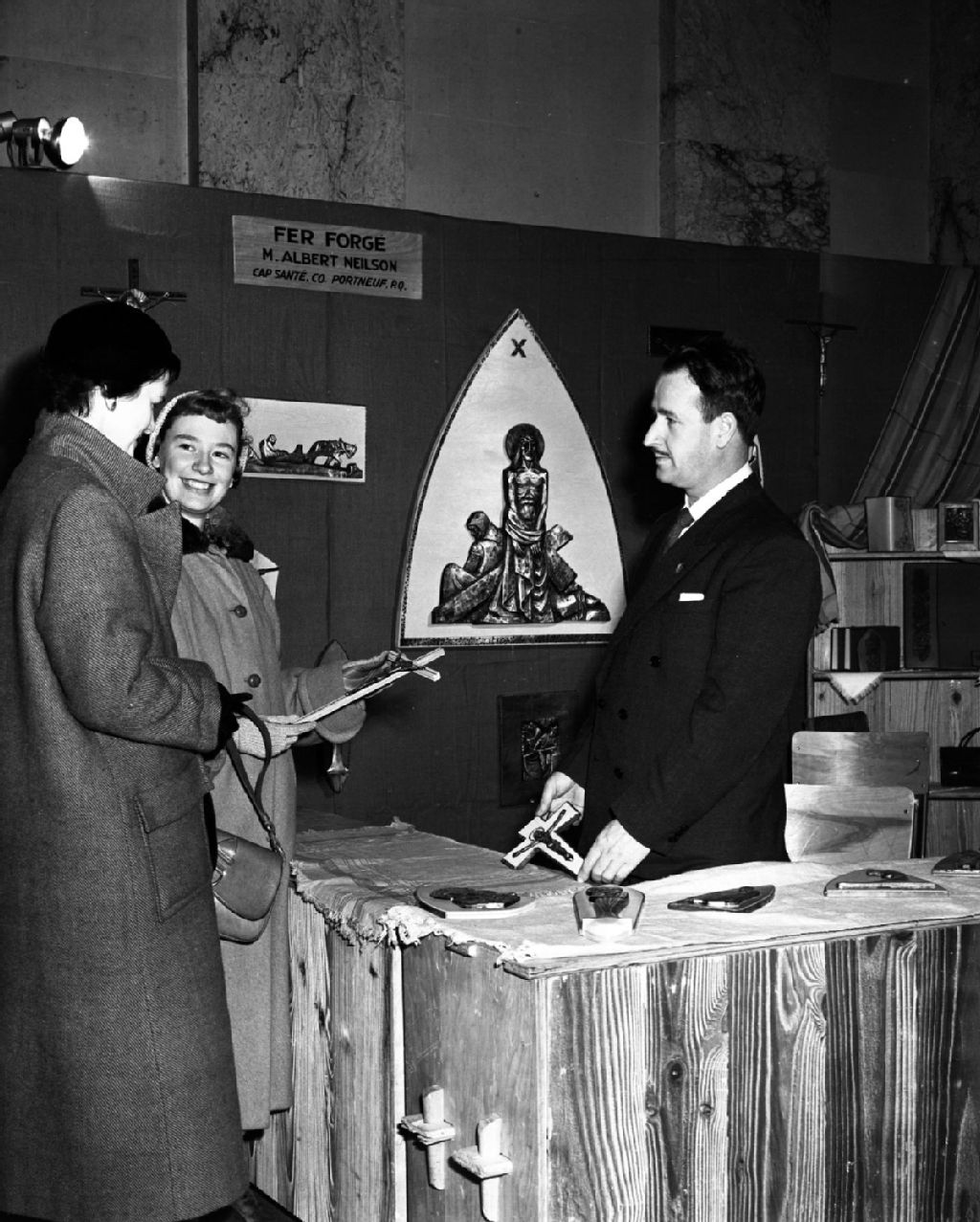 Objets religieux lors d'une exposition d'artisanat à l'Hôtel de ville de Montréal, [Vers 1955], Archives nationales à Montréal, Fonds Armour Landry, (06M,P97,S1,D8358-8358), Armour Landry.