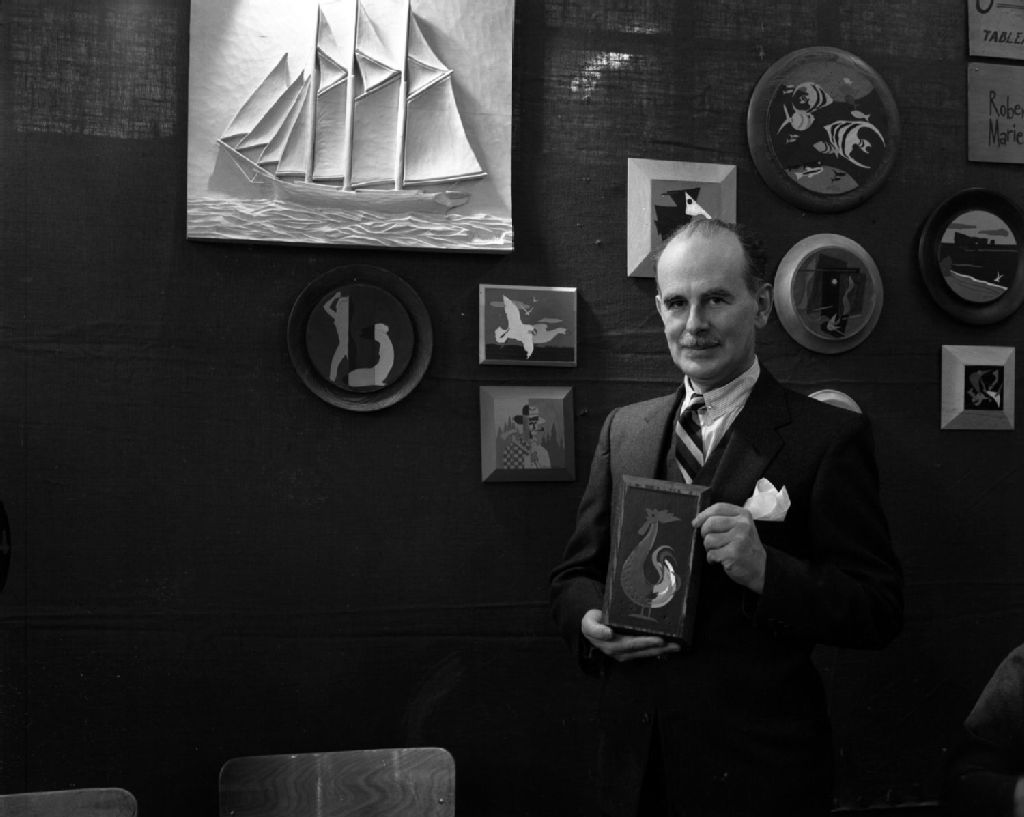 Exposition d'artisanat de Saint-Jean-Port-Joli : cuir incrusté de Jean-Marie Gauvreau et sculpture sur bois de André Bourgeault, [Vers 1960], Archives nationales à Montréal, Fonds Armour Landry, (06M,P97,S1,D8422-8423), Armour Landry.