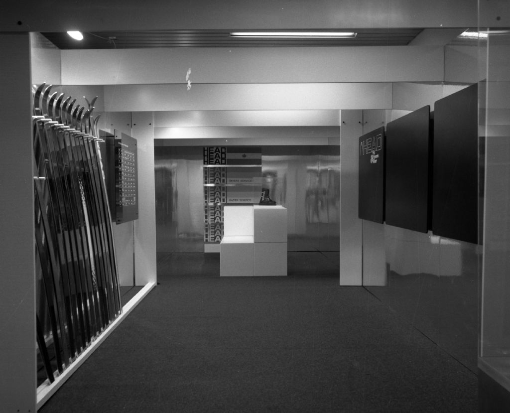 Étalage "Head Ski", création d'Atelier Jean Choquette, à la Place Bonaventure à Montréal, 7 avril 1970, Archives nationales à Montréal, Fonds Armour Landry, (06M,P97,S1,D849-850), Armour Landry.