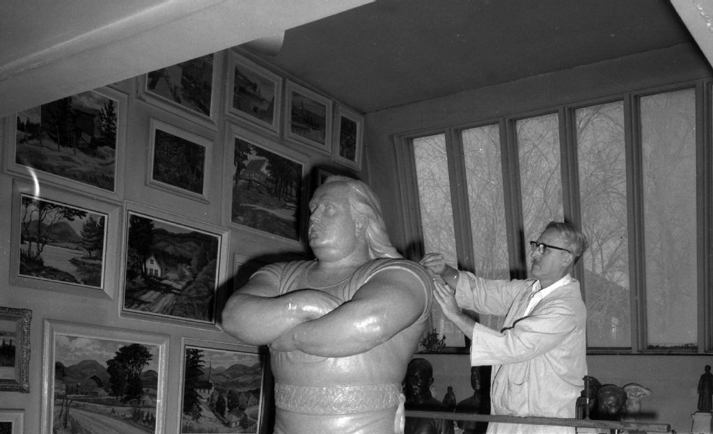 - La statue de bronze de Louis Cyr dans l'atelier de son créateur, Robert Pelletier