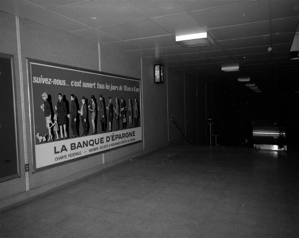 Panneaux publicitaires de la Banque d'épargne de la cité et du district de Montréal, devenue la Banque laurentienne du Canada, sur un mur de la station de métro Berri-de-Montigny (Berri-UQÀM) et de la station Champs-de-Mars, à Montréal, 4 mai 1971, Archives nationales à Montréal, Fonds Armour Landry, (06M,P97,S1,D991-992), Armour Landry.