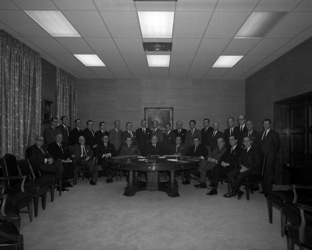 Réunion du Club des millionnaires de la Banque d'épargne de la cité et du district de Montréal, devenue la Banque laurentienne du Canada, au siège social de Montréal, rue Saint-Jacques, janvier 1969, Archives nationales à Montréal, Fonds Armour Landry, (06M,P97,S1,D996-997), Armour Landry.