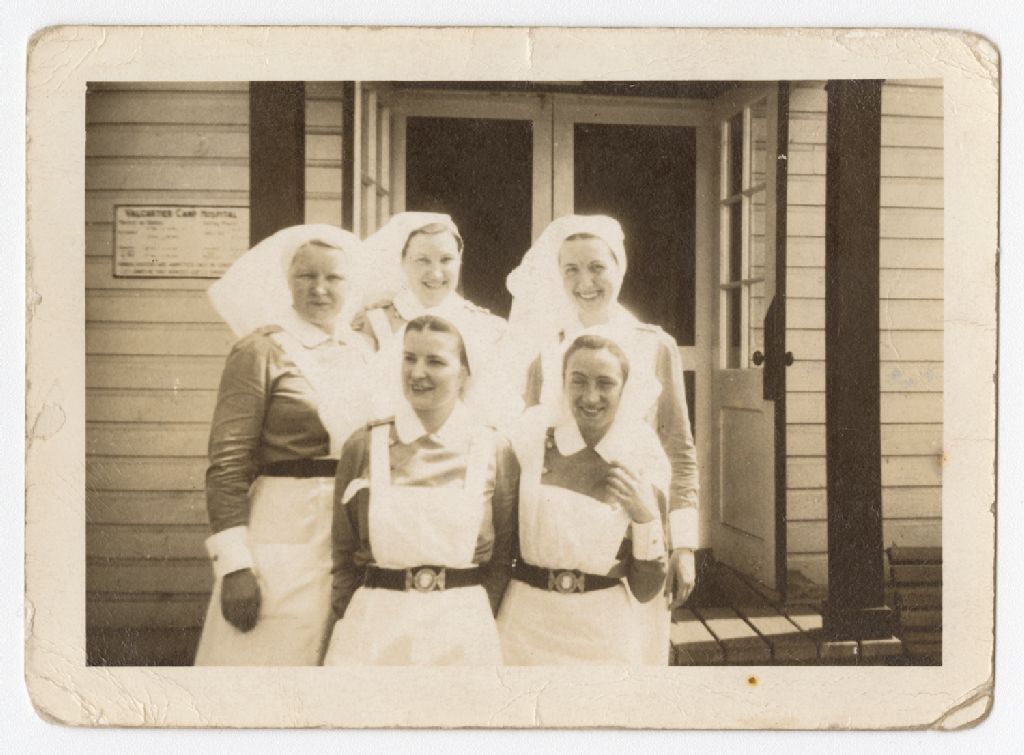 Cinq infirmières devant un hôpital militaire, [Entre 1939 et 1945], Archives nationales à Trois-Rivières, Fonds Hervé Côté, (04T,P114,S2,P3), Photographe non identifié.