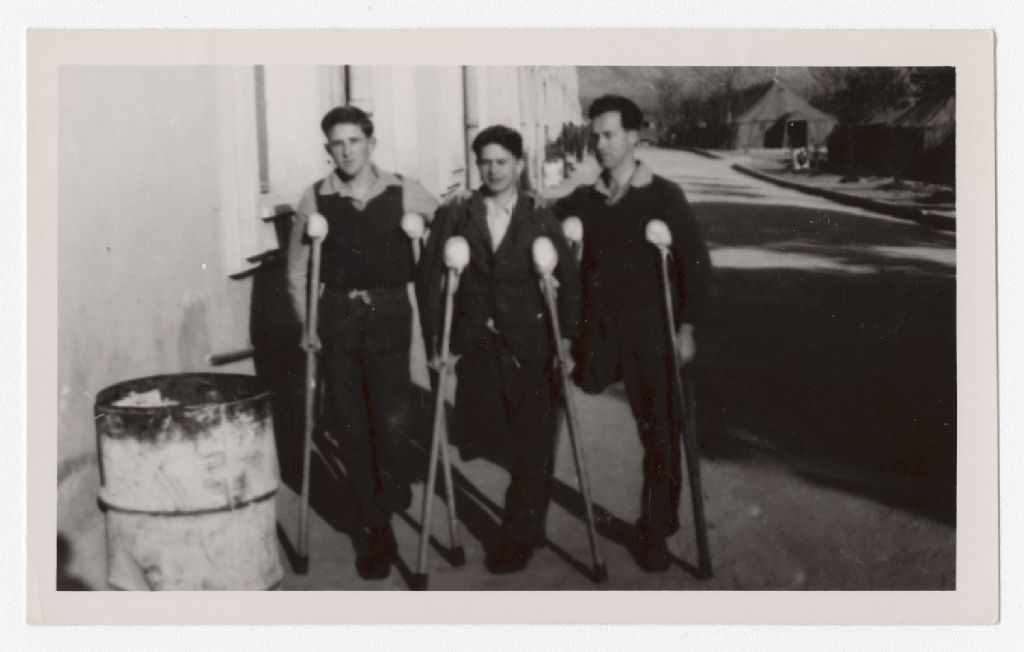 Cette photographie illustre trois jeunes hommes, probablement militaires, invalides de guerre. Ceux-ci sont en béquilles et ont chacun un bout de jambe amputée. Ils se trouvent à l'extérieur, dans une rue près d'un bâtiment et d'un baril de métal. Cette photographie a été prise entre les années 1939 et 1945