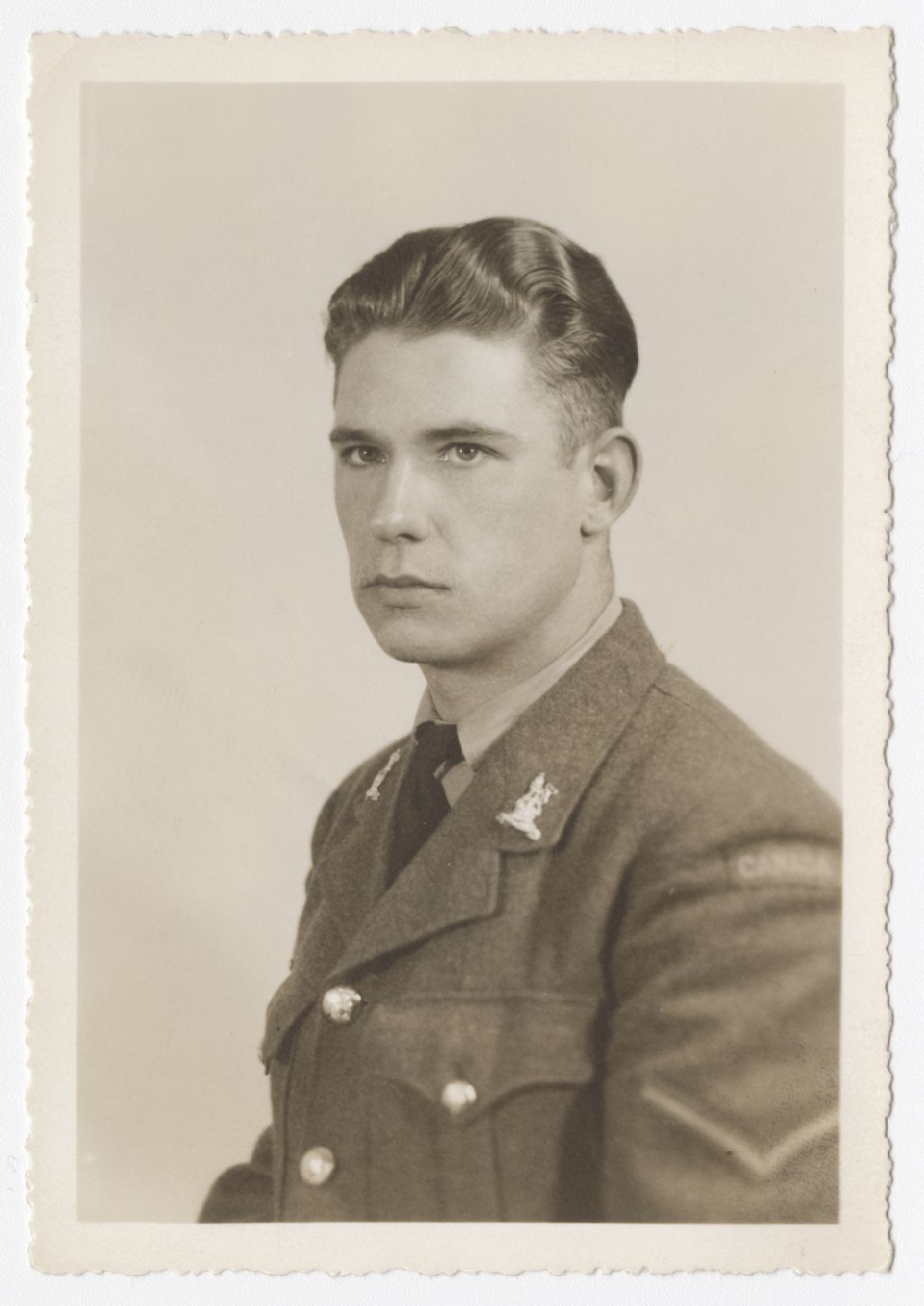 Portrait d'un soldat par un photographe, [Entre 1939 et 1945], Archives nationales à Trois-Rivières, Fonds Hervé Côté, (04T,P114,S3,P31), Photographe non identifié.