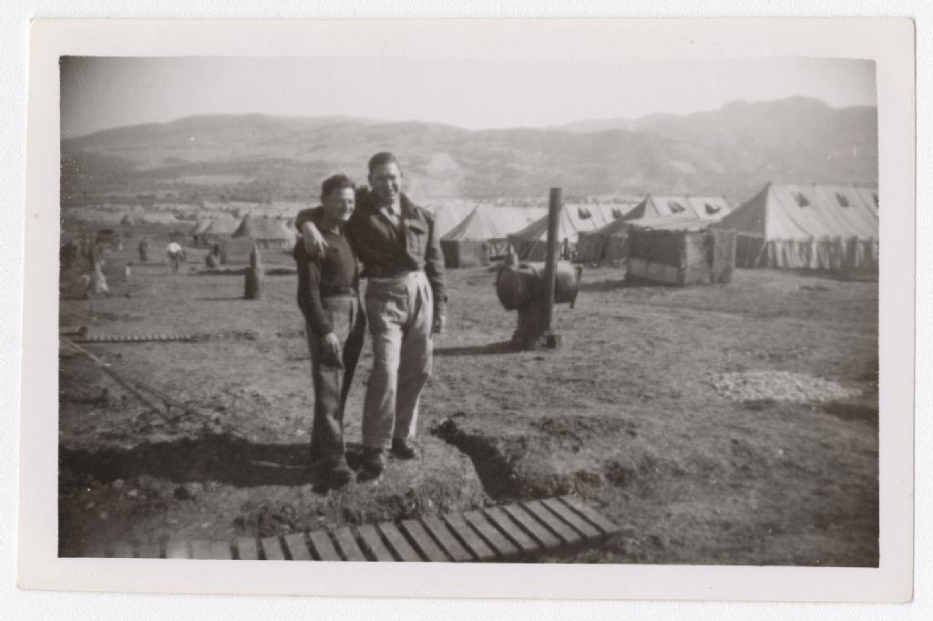 Cette photographie illustre deux soldats debout dans un campement. L'homme de droite a passé son bras sur l'épaule de l'autre homme. Devant eux, on observe une passerelle de bois sur petite crevasse du sol. On observe derrière eux un petit poêle avec une cheminée. En arrière-plan, on observe plusieurs autres tentes. Cette photographie a été prise entre les années 1939 et 1945