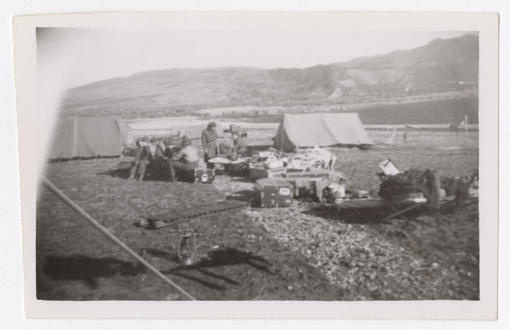 Cette photographie illustre des femmes militaires assises sur des valises dans un campement. On observe au premier plan une lampe à l'huile ainsi que plusieurs valises et bagages. En arrière-plan, on voit deux tentes, quelques champs et une montagne. Cette photographie a été prise entre les années 1939 et 1945