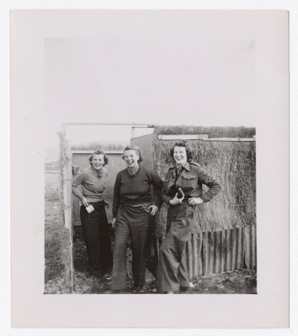Cette photographie illustre trois femmes militaires devant un bâtiment d'un campement. La femme de gauche a une tasse dans sa main. Celle de droite a aussi quelque chose dans sa main. Les trois femmes ont les mains sur leurs hanches semblant presque descendre leurs pantalons en souriant. Elles se trouvent devant un bâtiment d'un campement fait de tôle, de bois et de jute. Cette photographie a été prise entre les années 1939 et 1945